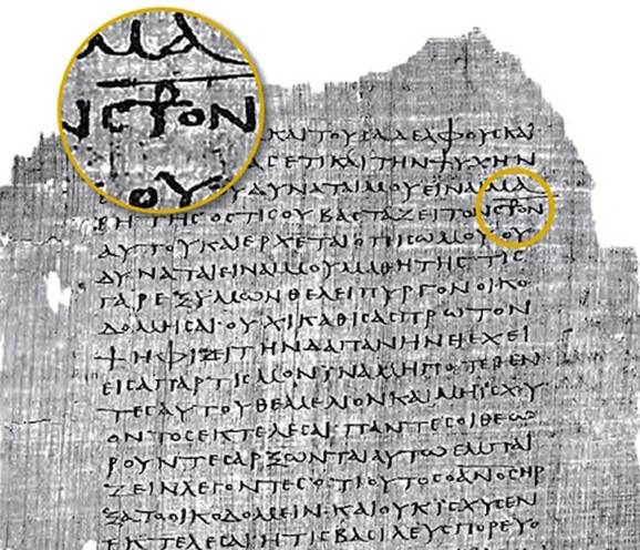 5 Bodmer papyrys 75 fra ca. år 200 e.Kr. med dele af Lukas og Johannes evangelierne. Der bruges et staurogram i ordet ’kors’ (Luk 14,27).