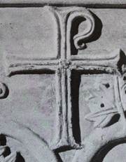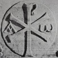 I øverste højre kvadrant er der ud over fisken en krogformet linie, der i toppen hænger sammen med feltets venstre ramme. Fisk hedder ‘ichthys’ på oldgræsk, og fra den tidligste oldkirke brugte man ichthys-bogstaverne som det første bogstav i ordene (på oldgræsk) ‘Jesus Christus Guds Søn Frelseren’ – altså en kort trosbekendelse. Den krogformede linje og den vertikale ramme er ikke et ‘P’ for Pax men et stort græsk ‘Rho’, som traditionelt kombineres med et stort græsk ‘Chi’, der ser ud som et kryds og tilsammen danner de to første bogstaver i Kristus, altså et kristogram (fig 2).