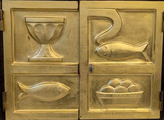 I Vor Frue kirke i Herlev er tabernaklets dobbeltdør (fig 1) inddelt i fire kvadrater og viser forskellige symboler, der er beskrevet i Vor Frue kirkes jubilæumsskrift fra 2010 (“Vor Frue kirke. 50 års jubilæum” 2010, side 31). Som beskrevet er symbolikken vedr. vin (øverste venstre kvadrant) og brød (nederste højre kvadrant) givetvis nadverens sakramente. Fiskene i nederste venstre og øverste højre kvadrant kan sammen med de fem brød i brødkurven i nederste højre kvadrant henvise til bespisningsunderet i Markusevangeliet kapitel 6 vers 35-44, hvor 5.000 mennesker ved Jesu mellemkomst blev mætte af to fisk og fem brød.