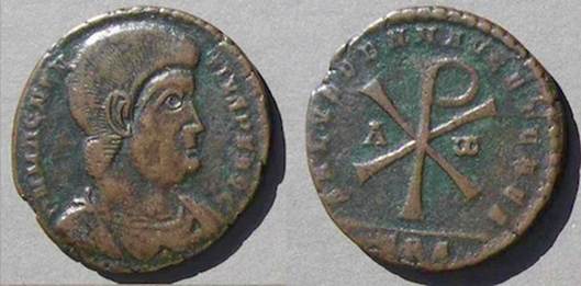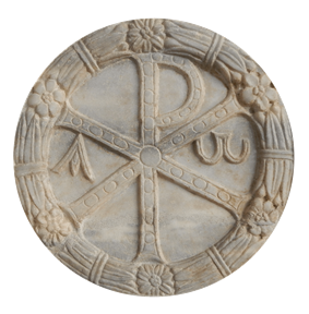 2 Kristogrammer: Kristen sarkofa fra 4. århundrede. Romersk mønt fra år 351 e.Kr. under kejser Magnentius, der viser Chi-Rho symbolet på bagsiden. Begge flankeret af første og sidste bogstav i det græske alfabet, Alfa og omega.